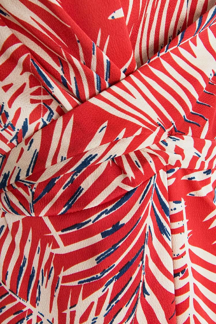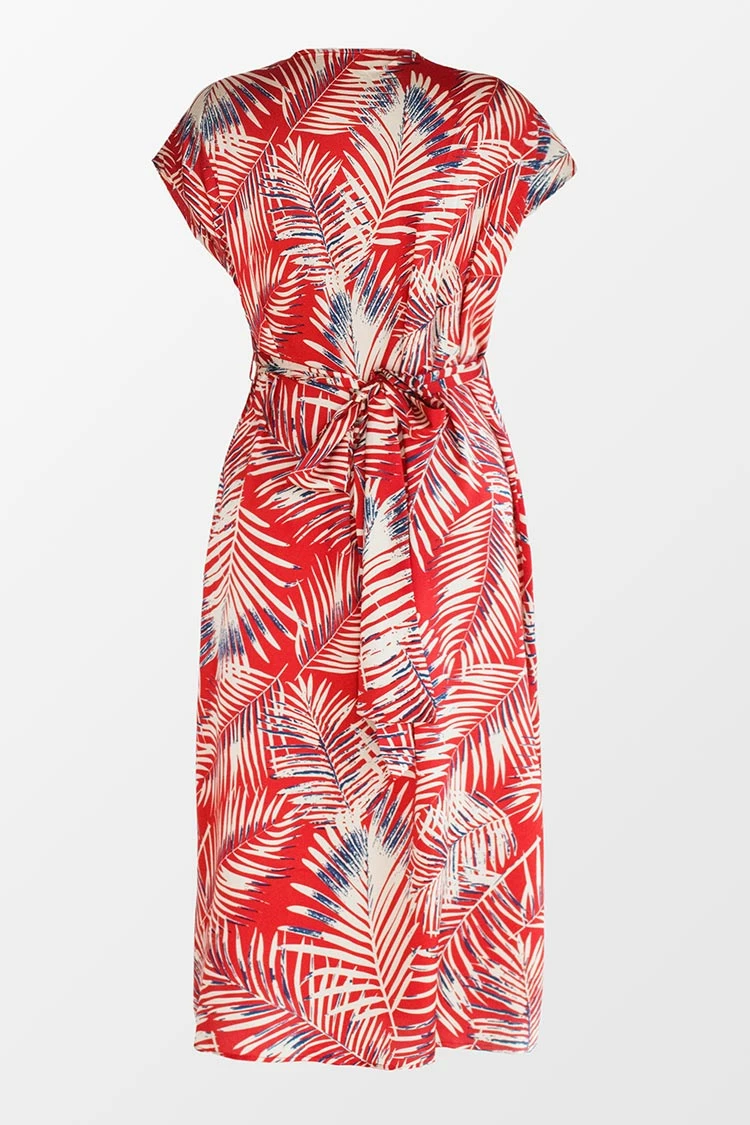 Embracing the sunny season ahead with our Emmy Leafy Wrap Dress. The leafy print contrast with red color create this wrap dress with strong feminine vibes.