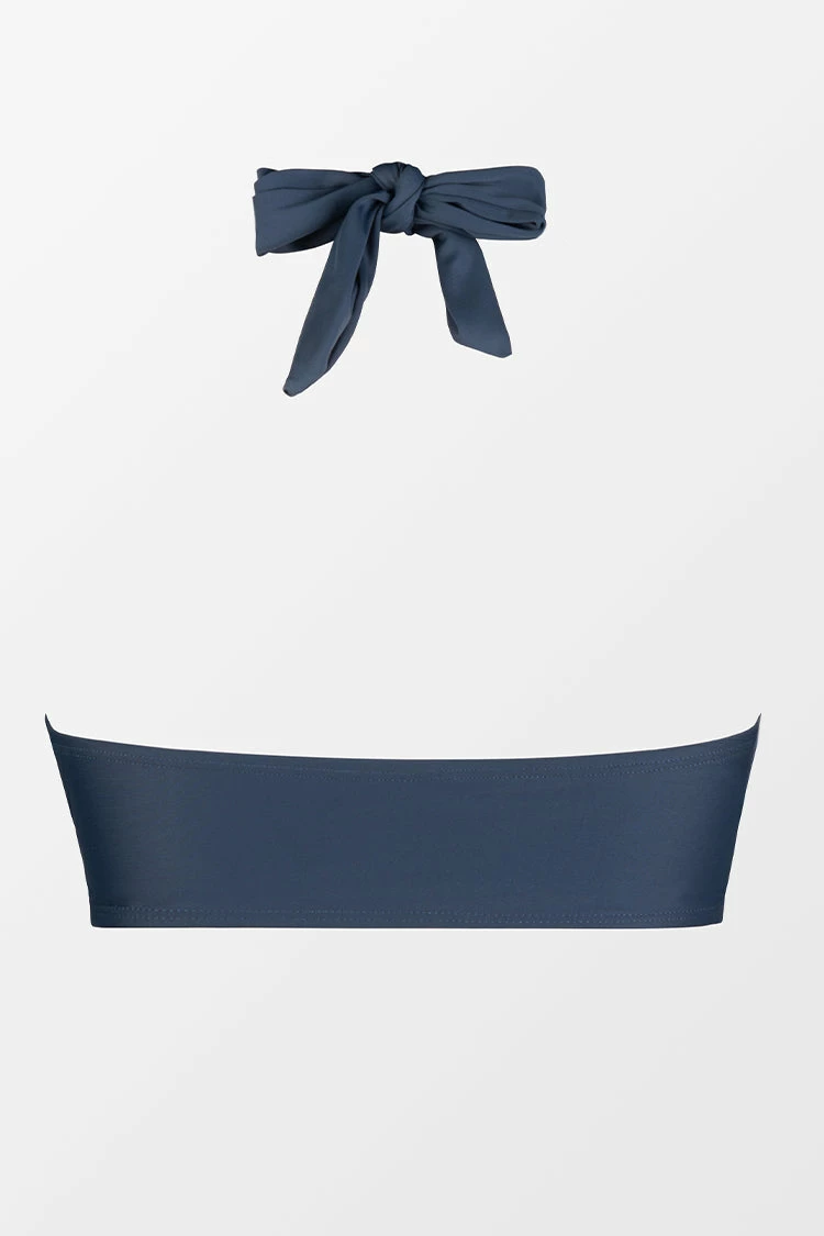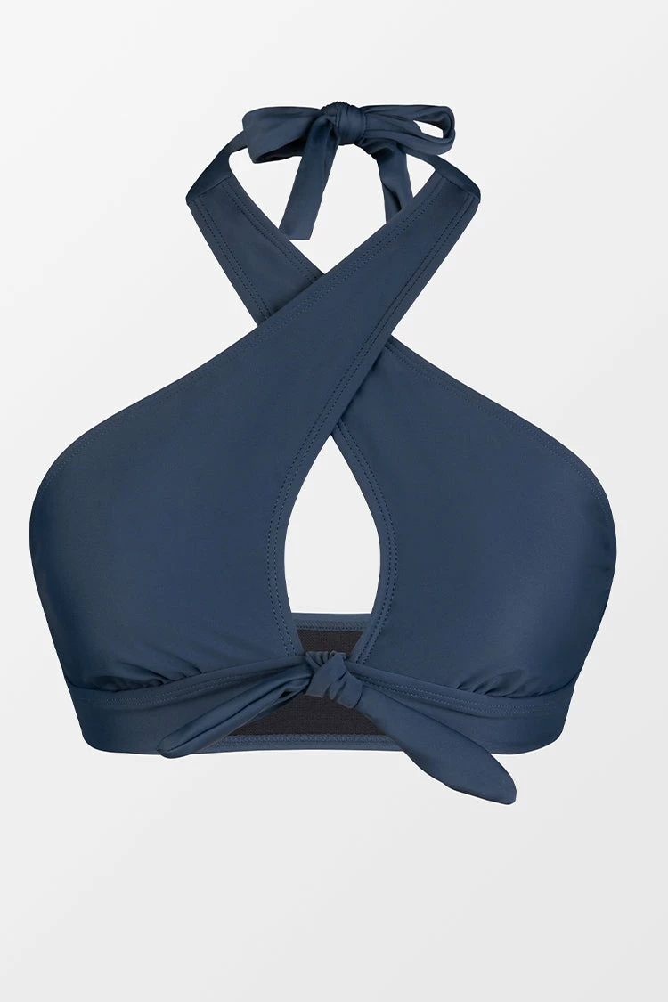 Cross halter straps and a keyhole detail bring an elevated look to this navy bikini top.