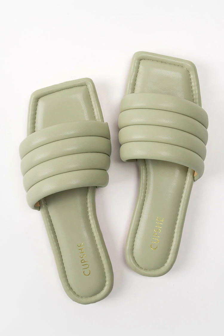 Our Sage Light Green Wide Band Square Toe Slide Sandals with low heel design. Wide band design for a comfit fit and on-trend look. Open-toe design offers easy wear and lasting comfort. Easy to pair with a variety of outfits for versatile styling options.