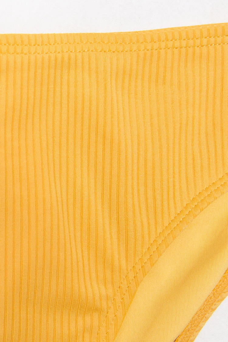 Get ready to catch waves in our Asha Rib Underwire Tie Front Bikini. The bikini top features ribbed material with underwired design. Matching bottoms has a low waist fit.