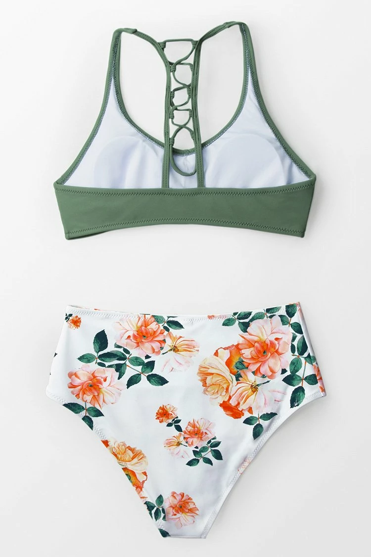 Lay in the sun with the Celadon Green And Floral Bikini. The green bikini top features ruched front and lace-up back. The white and orange floral matching high-waisted bikini bottom strikes the perfect balance between fashion and function.