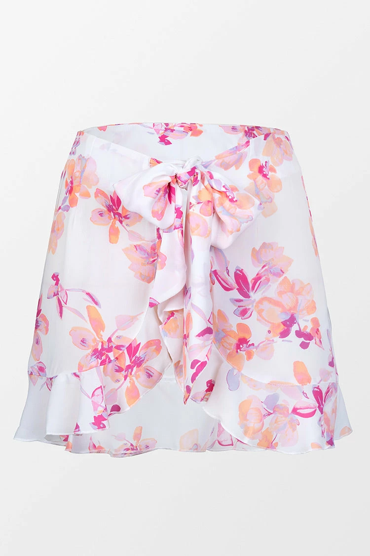 Add Gisselle Floral Tie Front Beach Skirt to your vacay wardrobe. Featuring floral print with ruffle hem and tie front design.