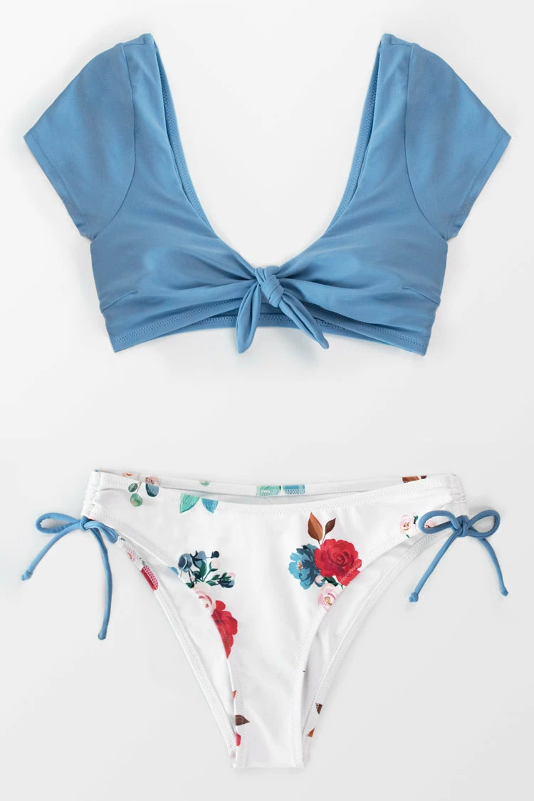 Super cute and versatile. Our Knotted Cap Sleeves Drawstring Bikini set will have you ready from sunrise to sunset. Features a knotted center front with cap sleeves and a scooped back. The perfect bikini top to wear on and off the beach. Matching low-rise bottom is detailed with drawstring sides with cheeky coverage.