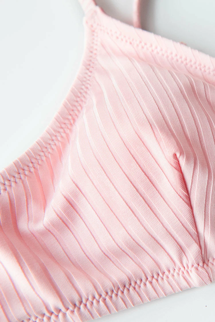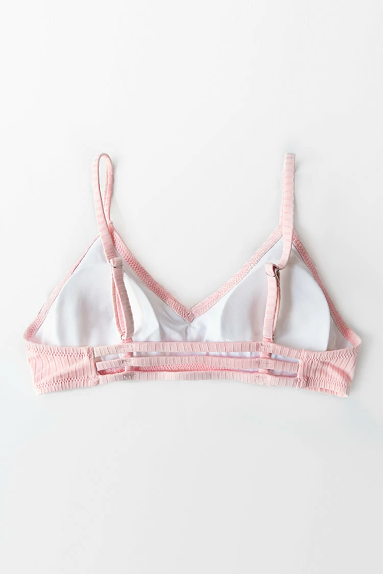 Get ready to hit the waters in our Light Pink Strappy Back Bikini Top. Our ribbed bikini top features strappy detailing at back with adjustable shoulder straps for the perfect fit. Complete the look with our Leafy Side Ties High Waisted Bikini Bottom.