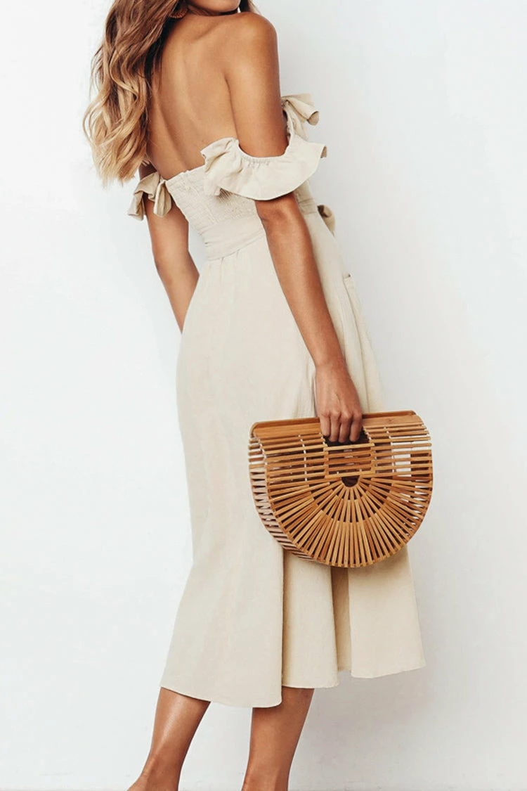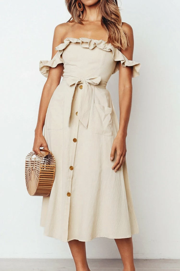 Fun and flirty, this Off The Shoulder Dress is the perfect summer dress. Its figure-flattering shape looks good on all body types, while the smocked back detail and ruffle sleeves make it extra sweet.