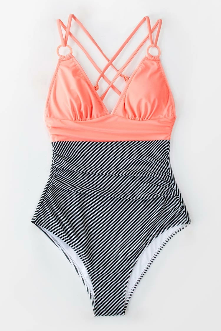 Our Peachy and Striped One-Piece Swimsuit is at the top of everyone’s swimwear list this season. Features adjustable double criss cross back straps. Bottom is a moderate cheeky coverage.