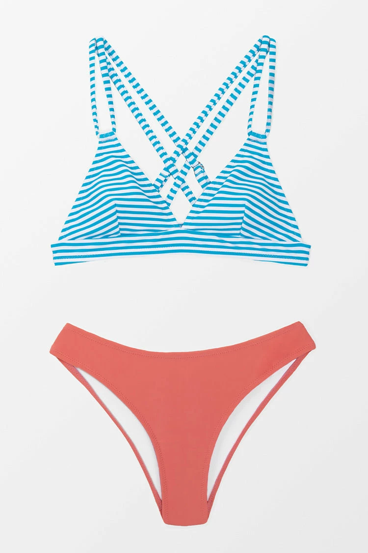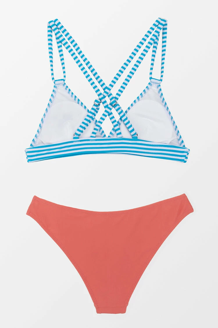 A sweet and chic style for your next girls trip, this Briella Triangle Striped and Peachy Crisscross Bikini will be a hit on the beach. Double crisscross back straps make this top sporty and cute! The bikini bottom has a mid cut with low waist.