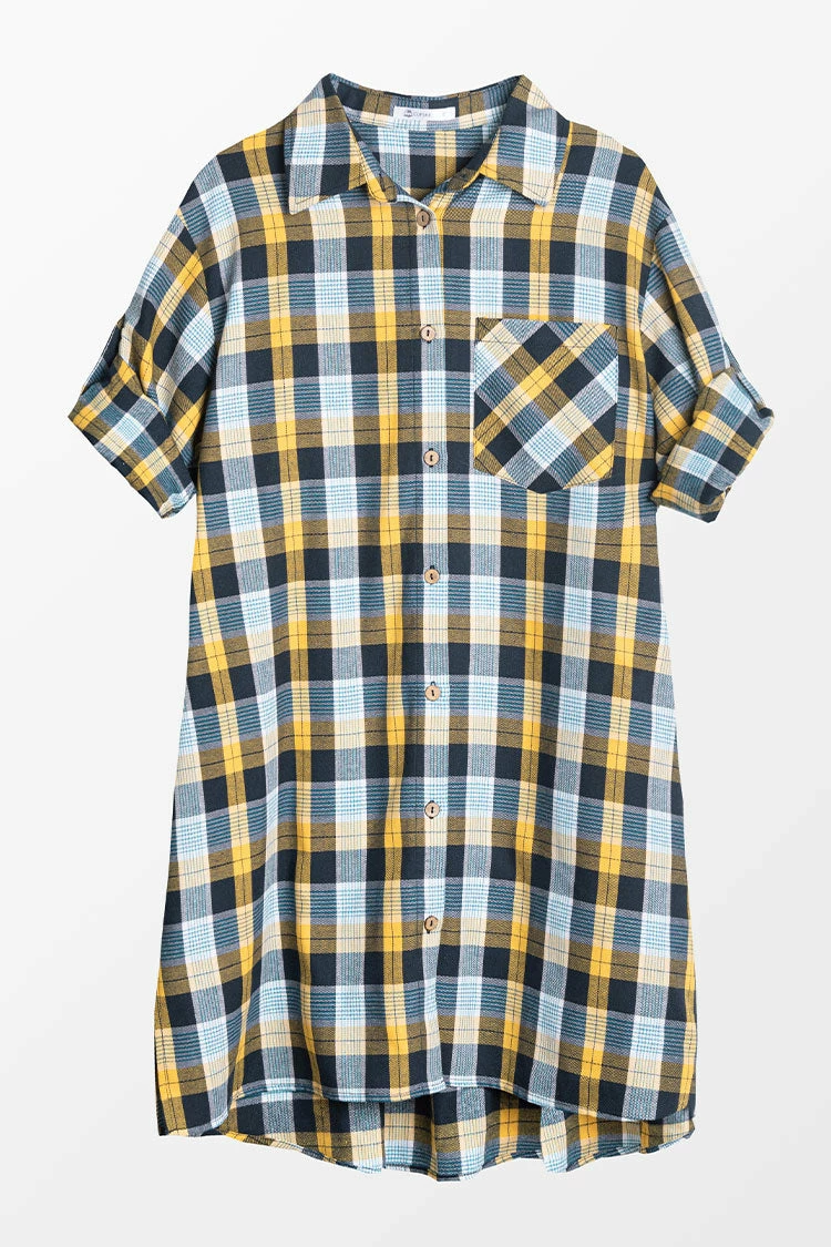 Look cute and comfy in the YYasmine Plaid Shirt Dress. This timeless style features a loose fit, rolled sleeves, and a button front. Pair it with booties and your favorite coat for a chic fall look.