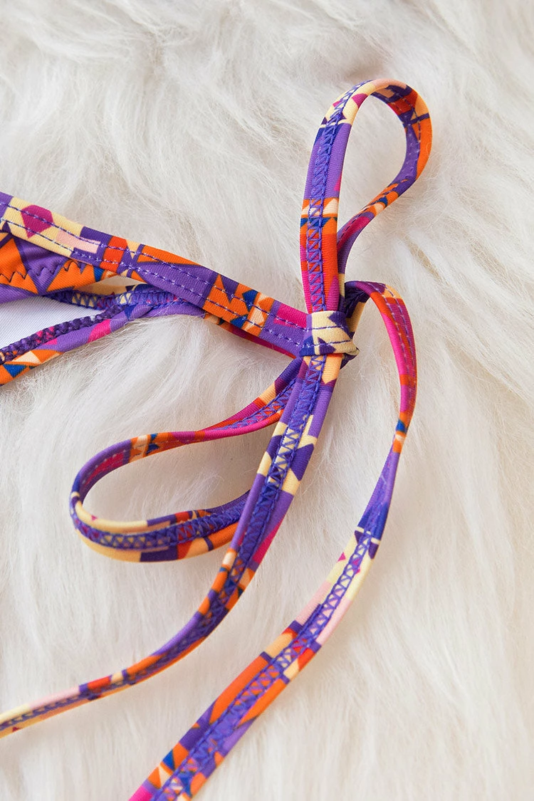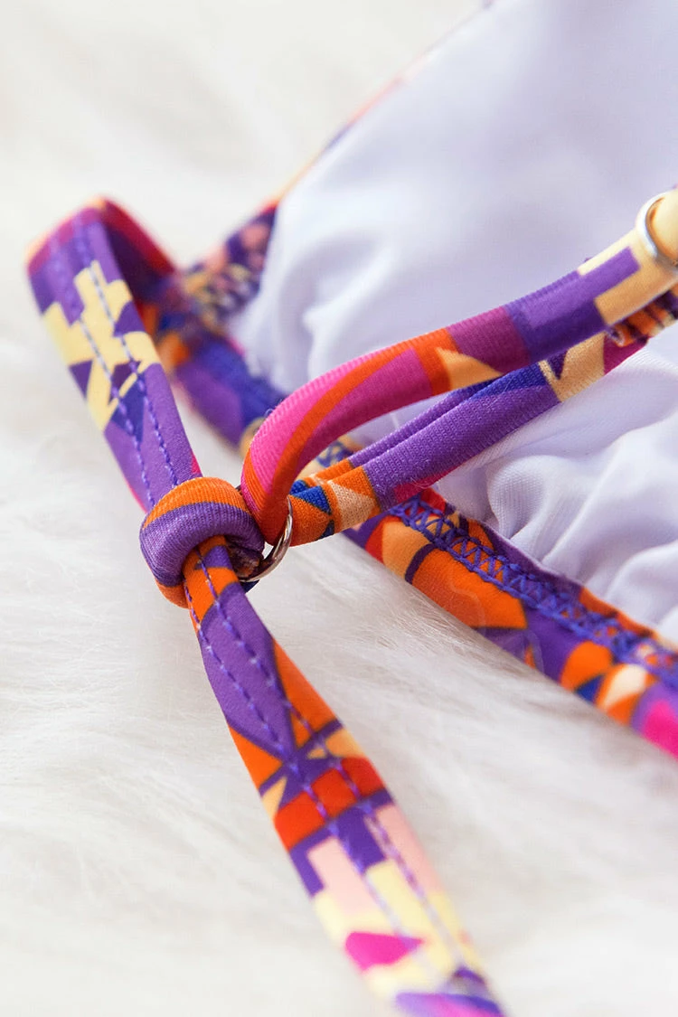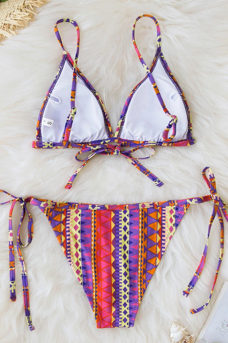 Calling all boho beach babes! The Boho Print Triangle Bikini is a must-have. This bikini set has a fun geometric print, adjustable straps and triangle cups with padding. The matching bottoms features cute fixed tie at sides.