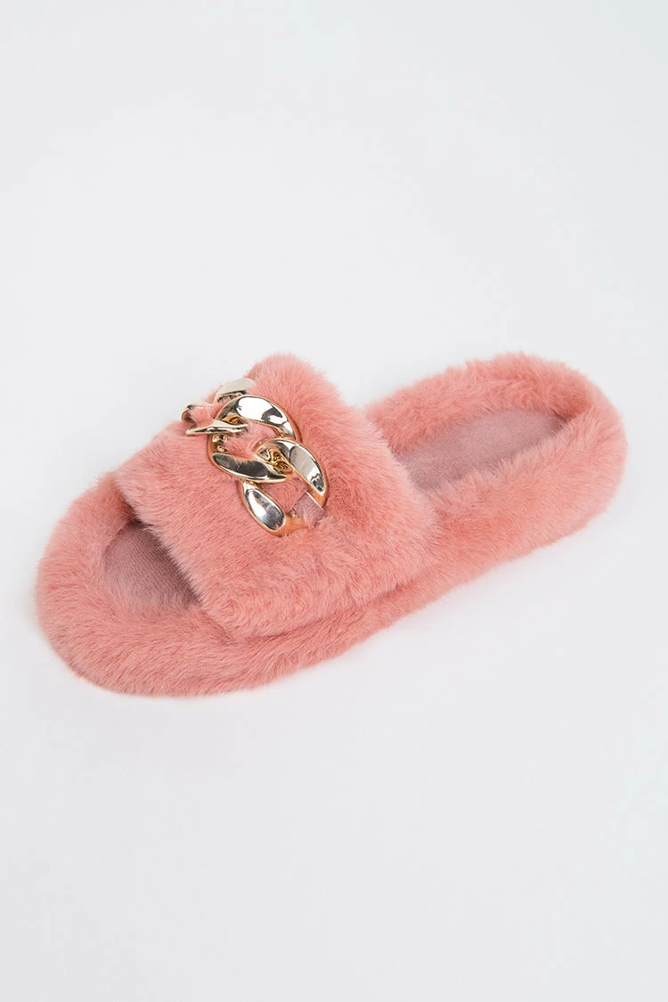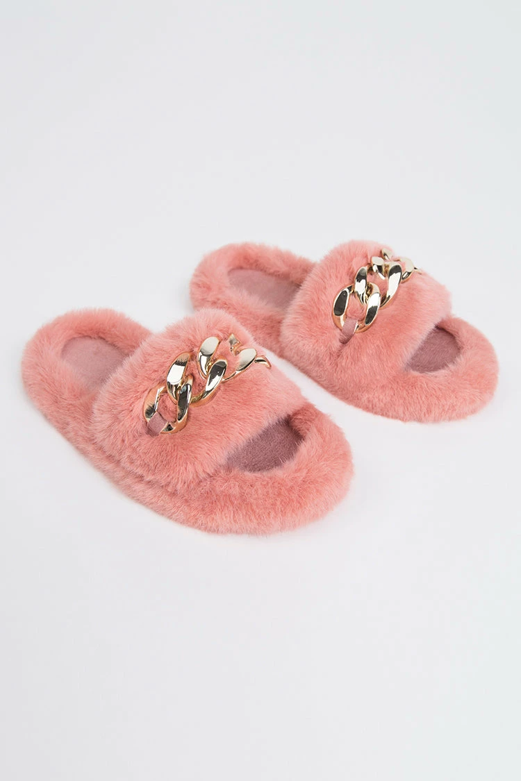 Our Brownstone Orange Fluffy Chain Decor Slippers are so comfy that it is always the ultimate pleasure to wear them. Suitable for indoor and outdoor. Metal ornaments are very interesting and beautiful!