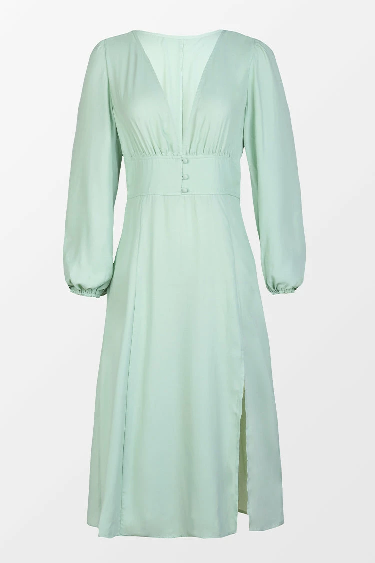 Add a little glamour to your next seaside escape with Dalary Plunge Button Front Split Dress. Features a plunge neckline, button and ruched at the front.