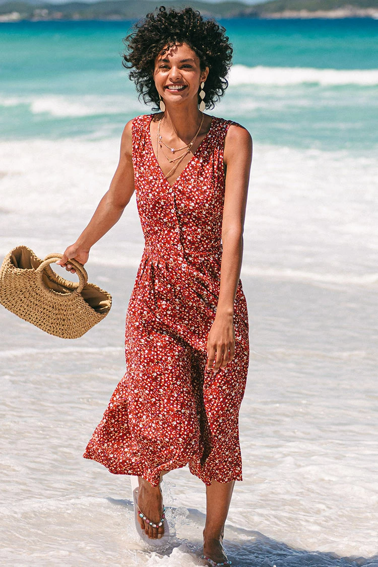 Cute and comfy! Our Milana Ditsy Button Front Tie Back Dress is perfect for all your summer travels. Features back tie and button details down the front.