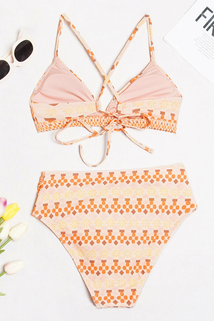 Stefanie Geo Print Lace-up Back Bikini is cute and flirty. Features geo print and lace-up back tie. The high waisted bottom has tie front detailing.