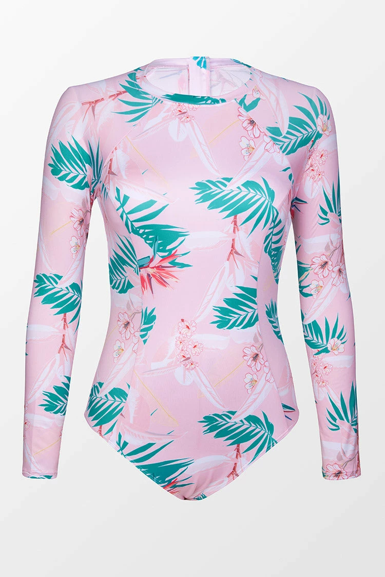 Tatyana Hawaiian Print Long Sleeve One Piece Swimsuit reminds us of a pretty tropical garden. It features a back zip for easy on and off and Long sleeves, which help prevent sunburn and bruising.