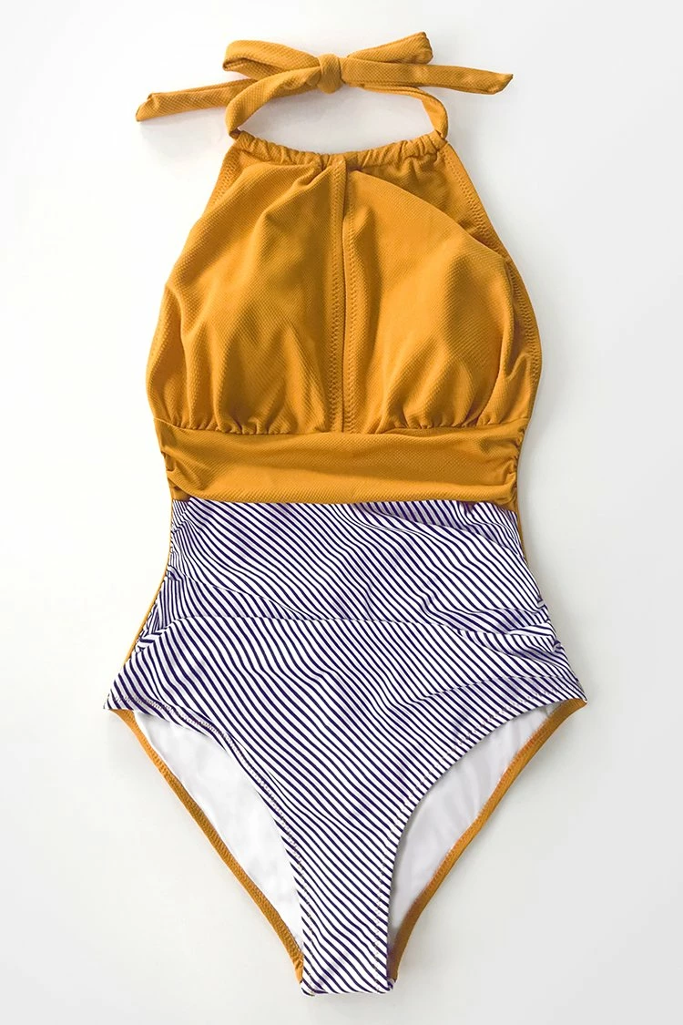 Look and feel your best in the Textured and Striped Halter One-Piece Swimsuit. This figure-flattering bathing suit contrasts a sunny mustard color with black and white stripes for a vibrant swim style. Ruching at the hips provides flattering tummy-coverage, while the self-tie straps let you adjust the fit and bust support.