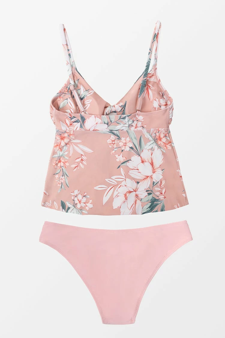 Feel super cute in our Breana Floral V-neck Cut Out Low Waisted Tankini. Thin straps fall to v-neckline and a cut out in the middle. Low waist hipster for the matching bottom.