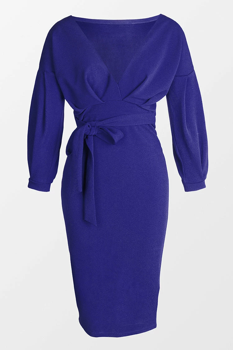 Give your everyday look an edge with this Chyna Blue 3/4 Sleeve Tie Waist Tea Length Dress. Featuring a tie belt design and a comfy fit. Style with slip-on heels and simple accessories for a look we’re loving.