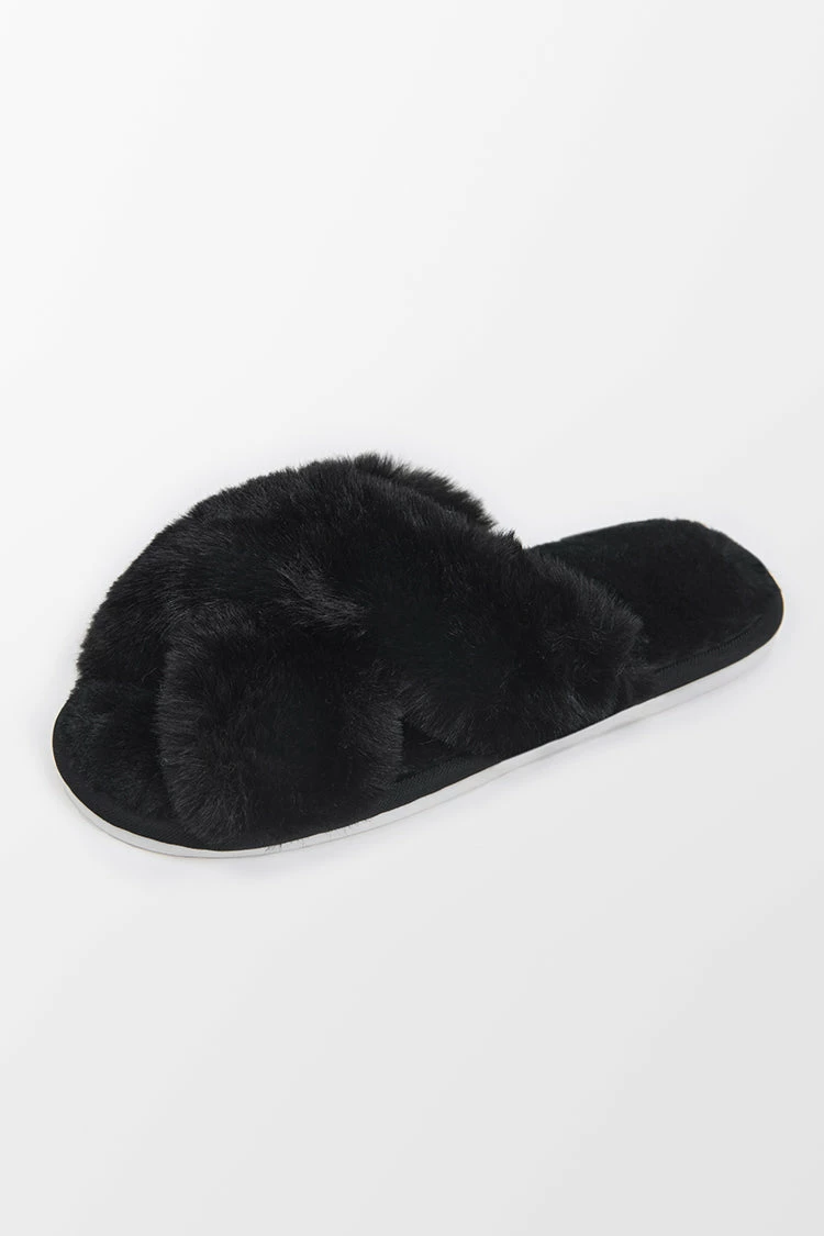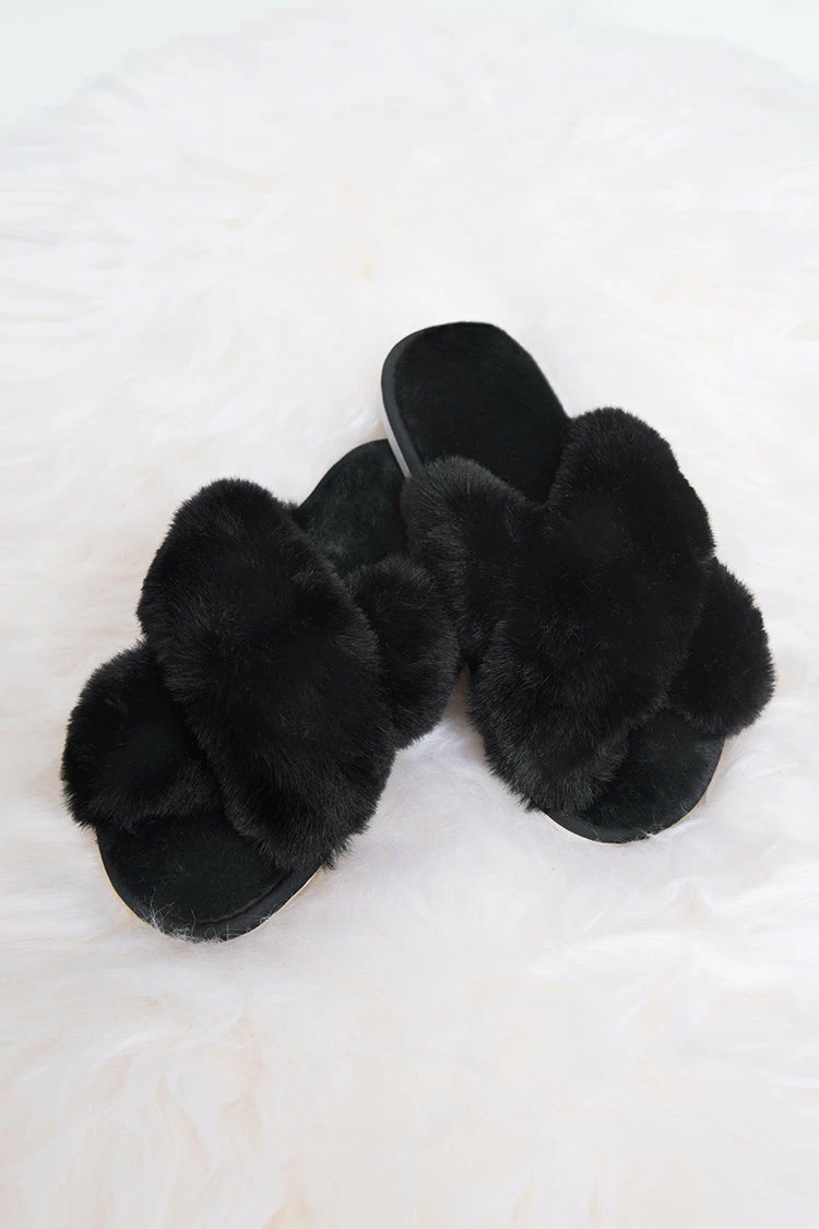 Our Karter Black Cross Strap Fluffy Slippers is a classic Slippers make for cold weather wardrobe staple; Easy slip-on design with pillow soft comfort. Cross Straps add some fun into this slippers.