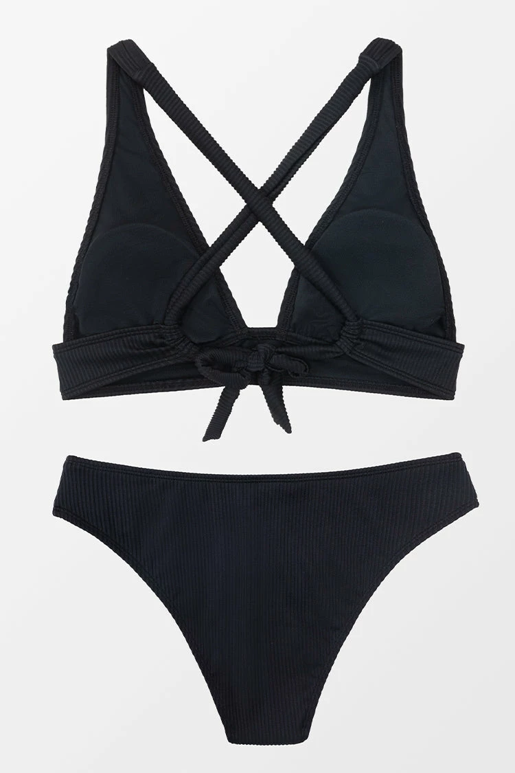 Soak up the sun in our Madeleine Black Rib Crisscross Back Bikini. The bikini top features rib material and crisscross tie back. Bikini bottom features mid waist fit .