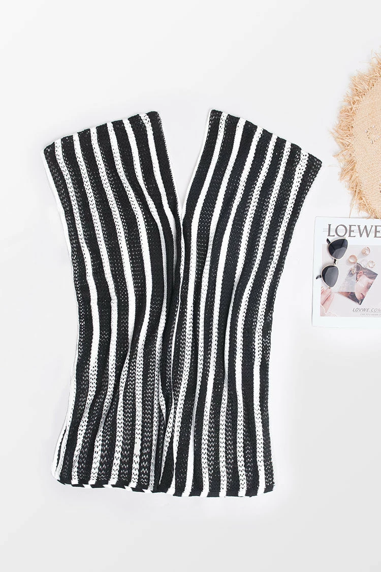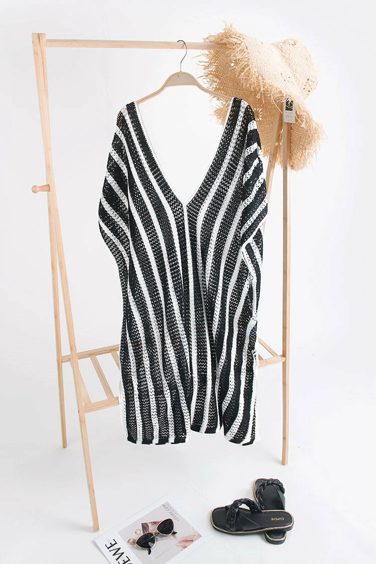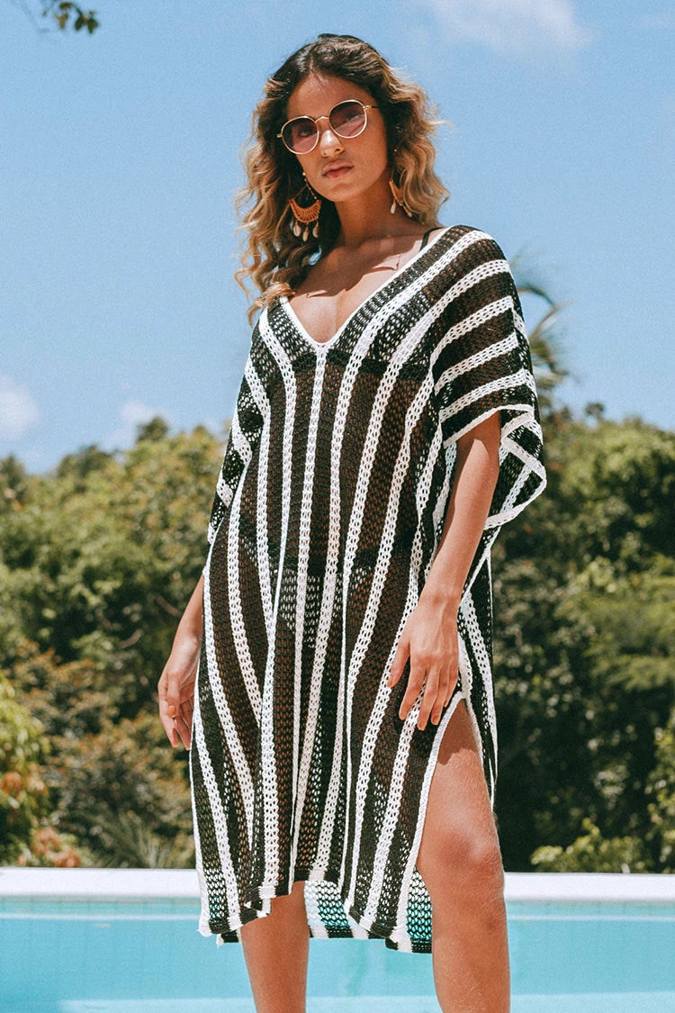 Not your average crochet cover up! Wear the Shawna Stripe V-neck Split Cover Up. Features with v-neckline on both sides and splits on side. Stripe all over this cover up.
