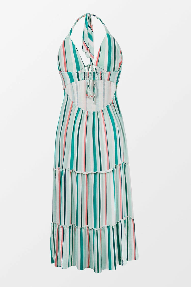 Get the party started, and look great while you do it in the Alondra Stripe Frill Halter Neck Elastic Waisted Slip Dress. Wide back cutout is accented with a gathered, elasticized strap. Create a casual and fashionable style for you.