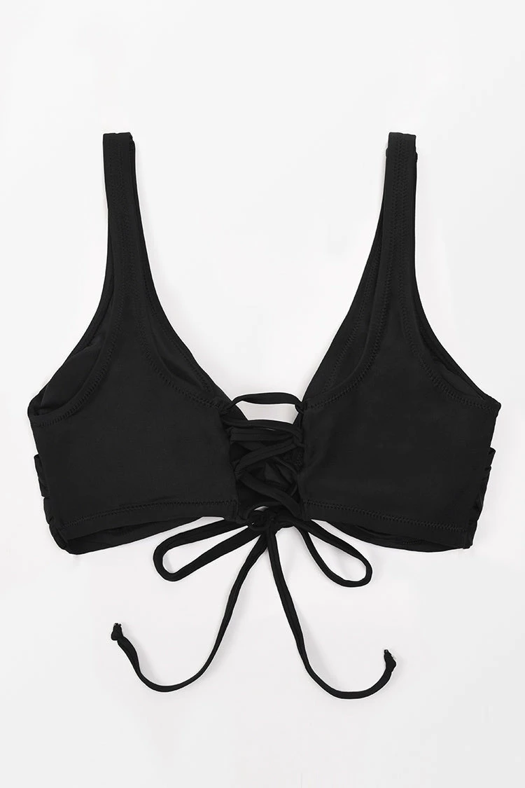 Chase the sun in our Cecilia Black V-neck Lace Up Plus Size Bikini Top. The top Featuring a v-neck on the front and lace up design on the back. Pair it with our Cecilia Floral High Waisted Bikini Bottom.