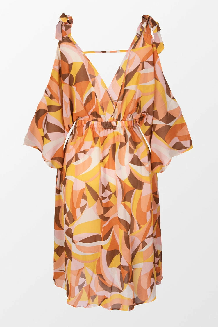 Never be without a perfectly romantic look with Elissa Geometric Print Tie Shoulder Cover-up Dress. Features with v-neckline and bow tie cold shoulder. The perfect cover up dress for any beach getaway.