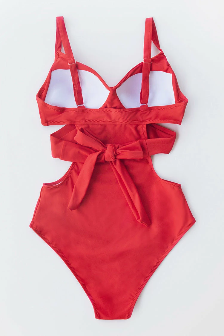 A fresh take on the classic solid red swimsuit, this Red Cutout One-Piece Swimsuit with Moulded Cups is stylish and flattering. Detailed with cutout sides and straps that cross and wrap around the front. Moulded cups help lift and shape the bust.