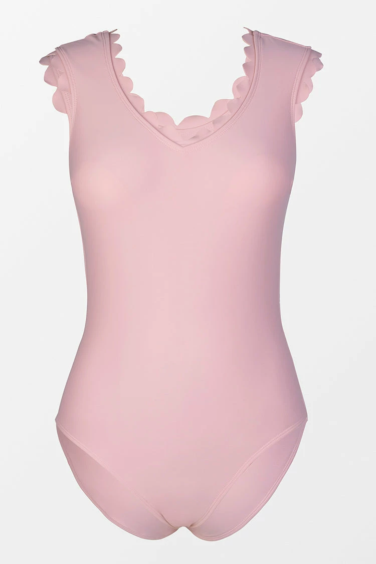 Rock a stylishly sweet look with this Sidney Pink V-neck Scalloped One Piece Swimsuit. Features with v-neckline and decorated with scalloped on the whole neckline. Sweet and girly style.