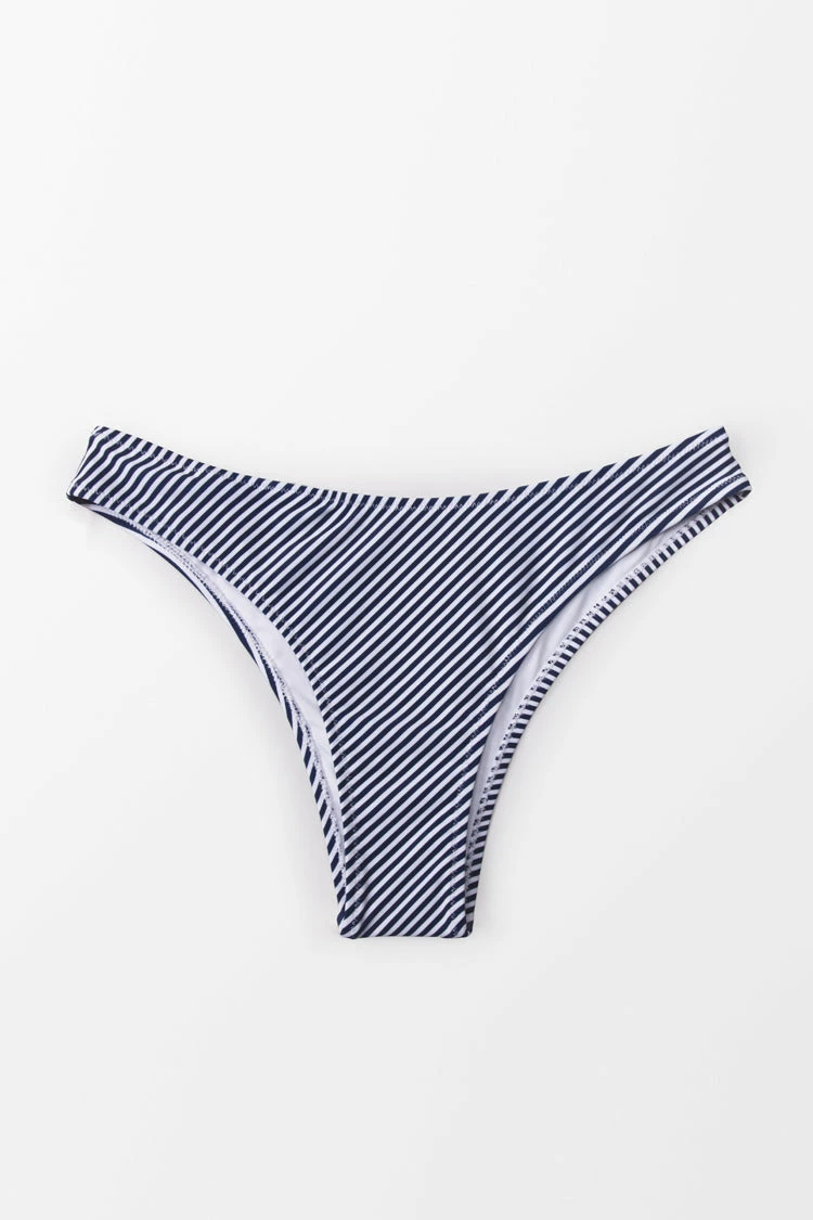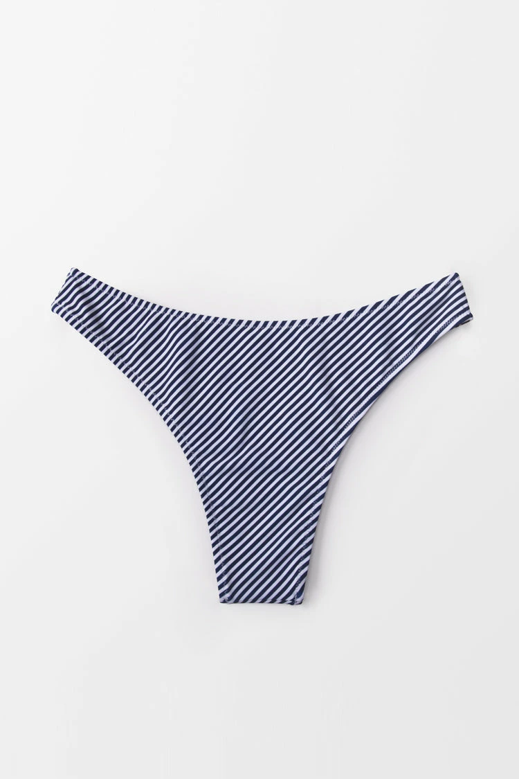These bikini bottoms are essential for dressing up or down. Featuring a black and white striped material with hipster style. Match with our Peach Pearl Ruffle Bikini Top to complete the look.