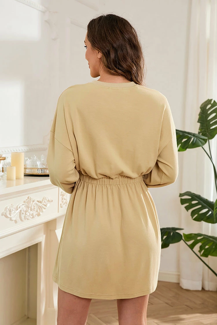 Our Aiyana Drop Shoulder Elastic Waist Dress choose the cream and botton, it can give you both comfortability and fashionability, the elastic wasit can make this dress be more suitbale for you.