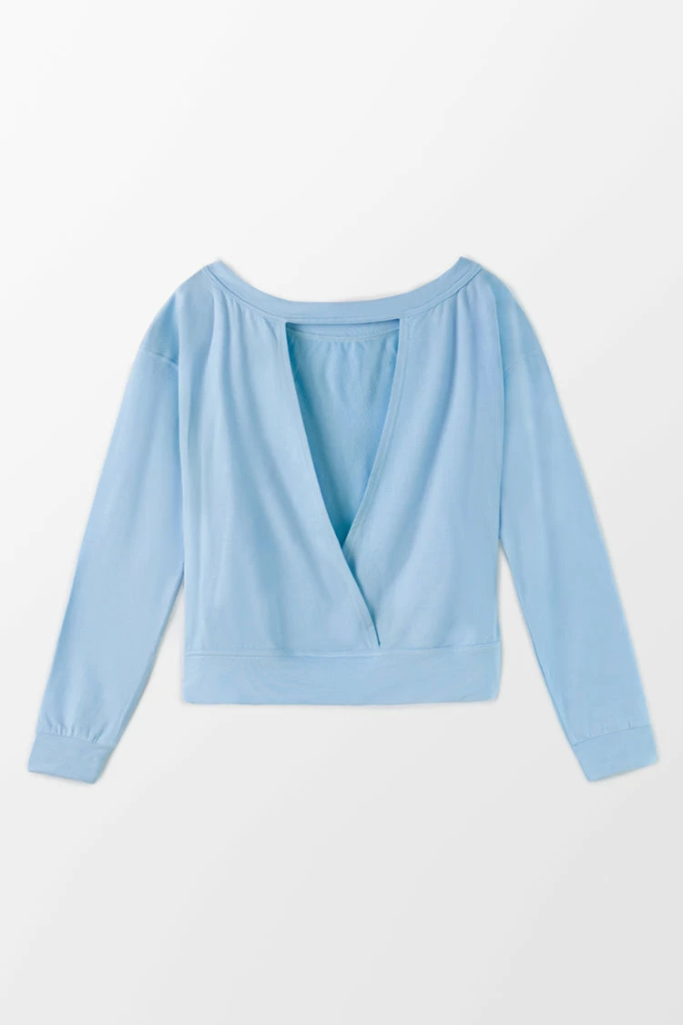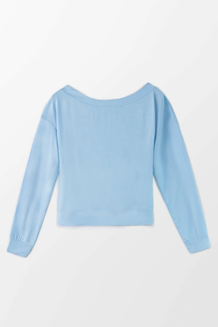 Get out of the office and snuggle up in this Cosmo Off Shoulder Sweatshirt! Coming in gorgeous neutral tone of blue, features backless detailing! Throw it on as you head out the door and you won’t regret it!