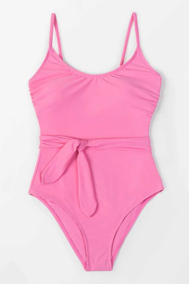 Reserve your space in the sun with Flora Pink Belt Knot One Piece Swimsuit. Featuring a self tie belt at the waist with a super sexy mid leg cut, the perfect suit for a day at the beach.