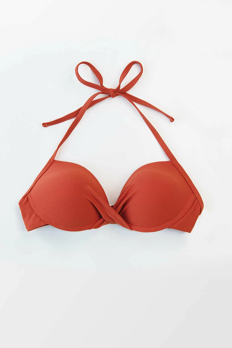Stand out from the beach crowd in this Orange Twist Halter Bikini Top. Features a halter tie neck silhouette for a flattering fit. A great top to mix and match with Cupshe’s bikini bottoms.