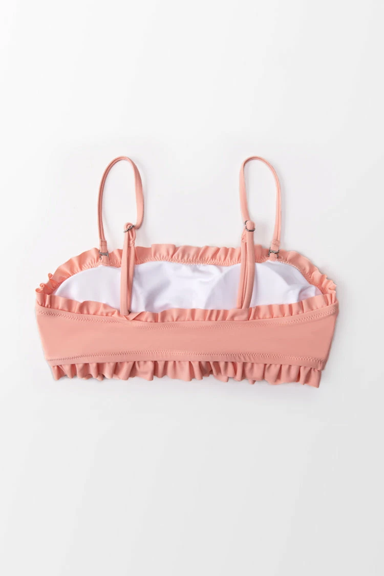 Bring the heat in our Peach Pearl Ruffle Bandeau Bikini Top. Features flirty ruffle trim with adjustable and removable shoulder straps. Mix and match with the Stripe Hipster Bikini Bottom to complete the look.